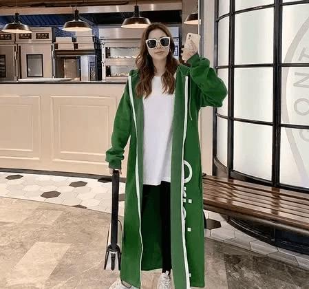 刷毛加厚長款外套 冬季寬鬆拉鍊洋裝 綠色