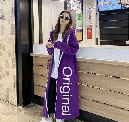 刷毛加厚長款外套 冬季寬鬆拉鍊洋裝 紫色